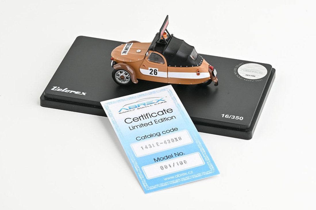 Poslat dotazKovový sběratelský model legendárního vozítka Velorex v měřítku 1:43. Limitovaná edice - vyrobeno pouze 146 kusů! Opatřeno výrobním číslem na podvozku. Model kompletně vyrobený v České republice!