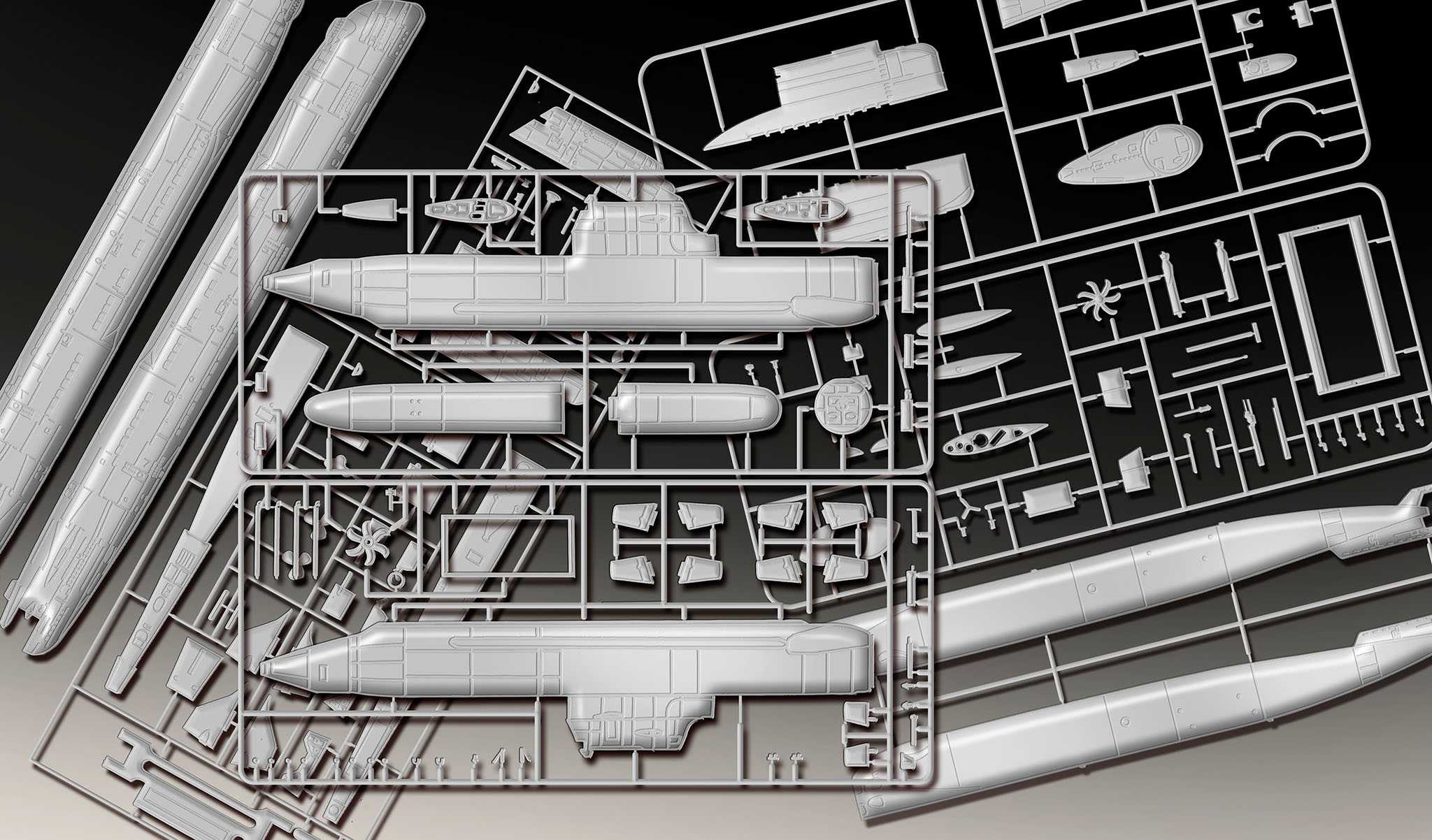 Modely ponorek ke slepení. Velikost: 1:144; 53,3 cm + 33,8 cm + 39,7 cm. Balení obsahuje: 154 dílků ke slepení.