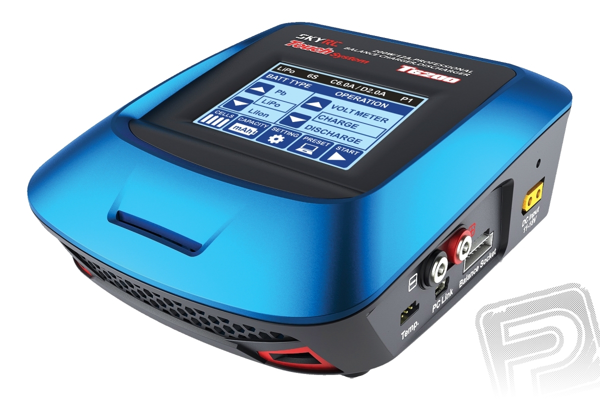 Nabíječ SKY RC T6200 Touch 200W je inteligentní nabíječ s dostatečným výkonem pro pokročilého rekreačního modeláře s uživatelsky příjemnou obsluhou pomocí dotykového displeje. Je určen pro napájení z olověného akumulátoru 12 V (autobaterie nebo trakční olověný akumulátor) nebo vhodného stabilizovaného síťového zdroje (12-18 V/20 A).