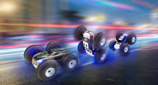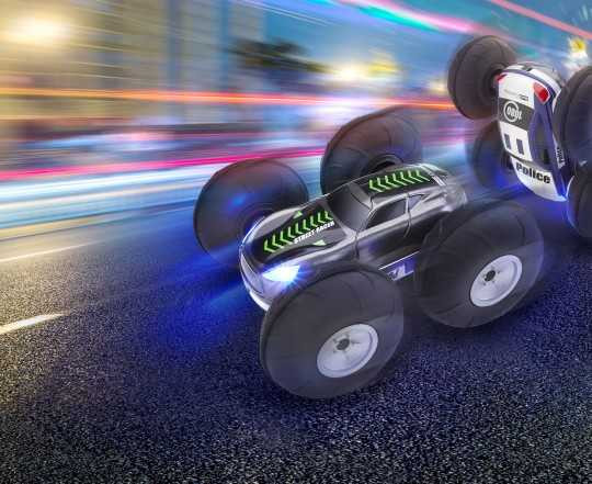 Toto oboustranné autíčko snadno mění převleky, spojuje v sobě totiž lovce i loveného. S každým přetočením tak přecházíte z jedné role do druhé. Díky velkým pneumatikám, samostatném pohonu jednotlivých kol a předním LED světlometům zvládnete FlipRacer řídit velmi přesně třeba i ve tmě. Vše je okamžitě připravené k použití hned po vyjmutí z krabice. Díky napájení pomocí AAA baterií nemusíte zbytečně čekat na nabíjení.