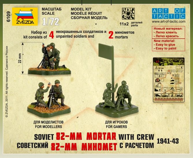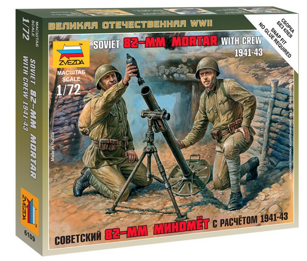 Poslat dotazPlastikový model sovětského minometu ráže 82 mm s obsluhou z období let 1941-43 v měřítku 1:72. Kit obsahuje nenabarvený minomet ráže 82 mm a dvě figurky (obsluhu minometu). Není třeba lepidla!