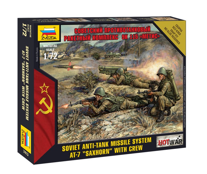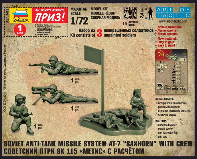 Plastikový model sovětského protitankového systému AT-7 s obsluhou v měřítku 1:72. Sada obsahuje 3 nenabarvené figurky. Není třeba lepidla!