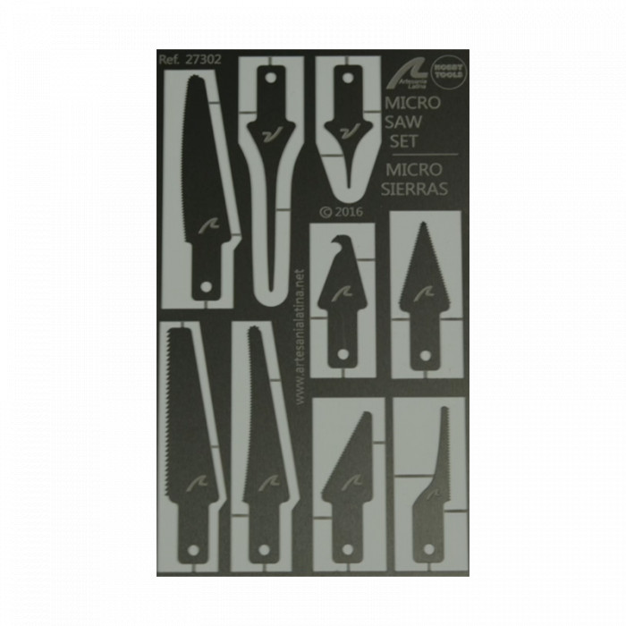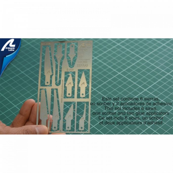 Modelářská sada fotoleptaných ocelových mikropilek a aplikátorů kyanoakrylátového lepidla. Set obsahuje 6 mikropilek, které lze použít při práci se dřevem nebo plastem. Dále jsou v sadě obsaženy dva aplikátory kyanoakrylátového lepidla, s jejichž pomocí docílíte přesného nanesení lepidla na extrémně malé plochy či hůře přístupná místa. Pro dosažení dlouhodobé životnosti jsou nástroje vyrobeny z vysoce kvalitní nerezové oceli.