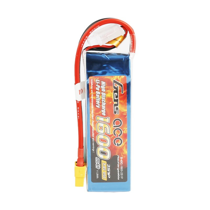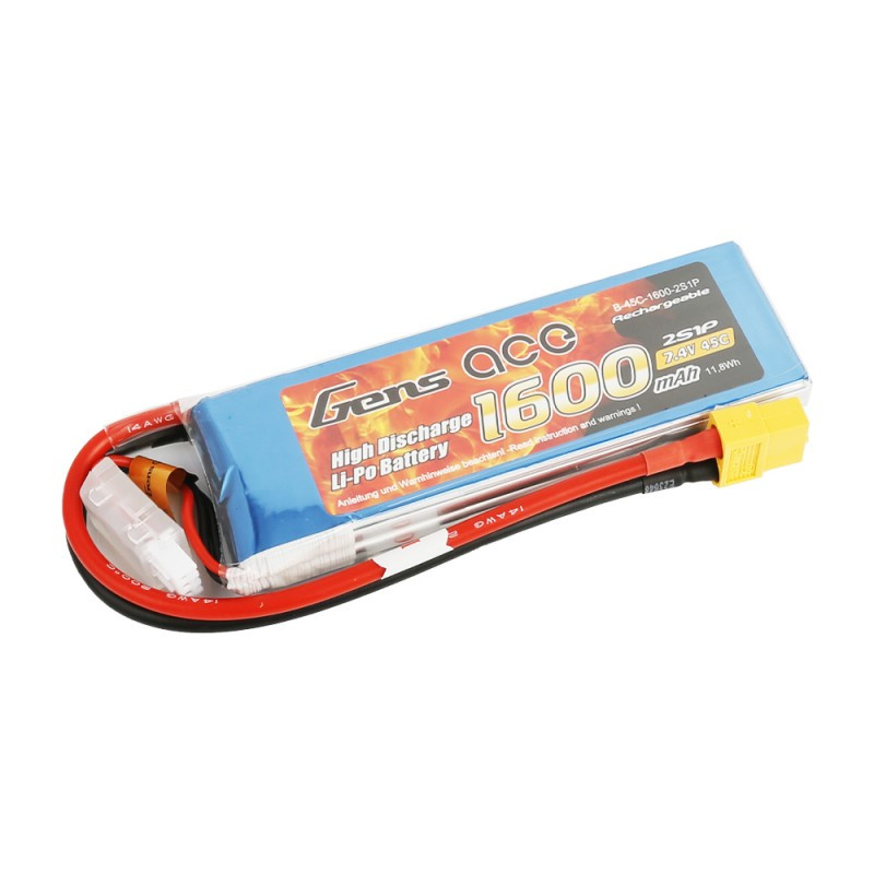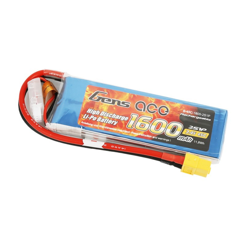 Lithium-polymerový akumulátor Gens ACE LiPo - 2S 1600mAh 7,4V 2S1P XT60 (45C) s maximálním vybíjecím proudem až 90C je ideální pro použití v RC modelech letadel a vrtulníků.