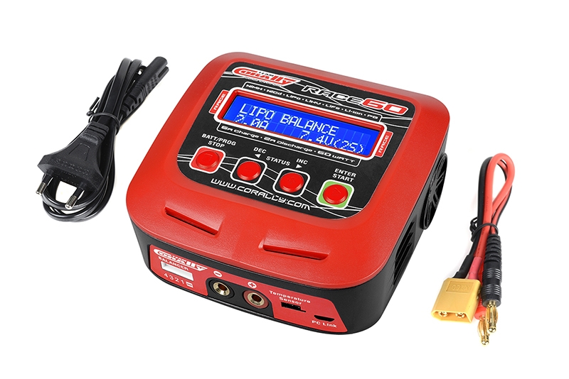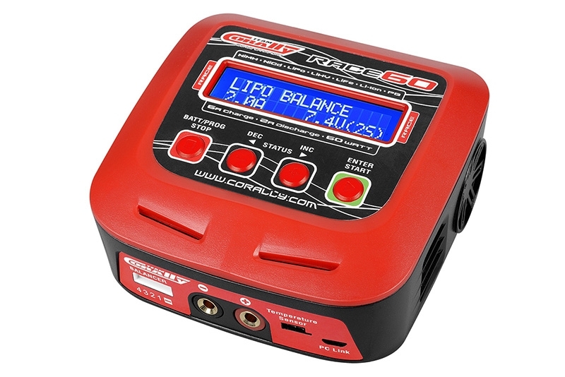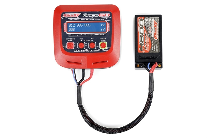 Cenově dostupný nabíječ Corally Race 60 má nabíjecí proud až 6 A, vybíjení 2 A / 10 W, podpora LiPo, LiIon, LiFe, LiHV, NiCd, NiMH a olověných baterií. Výborně čitelný dvouřádkový displej. Napájení ze sítě nebo ze zdroje 12 V.