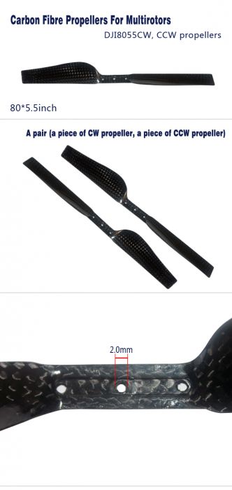 Pár carbonových vrtulí pro multicoptery 8x5,5(levotočivá+pravotočivá). Tvar listů optimalizován pro multikoptery DJI.