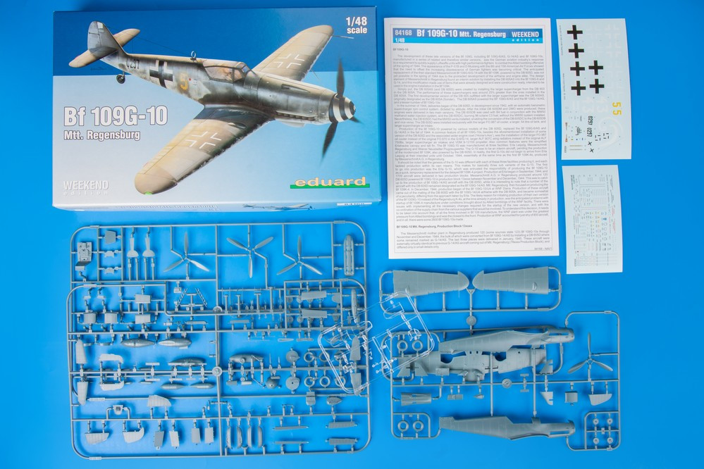 Plastiková stavebnice německého druhoválečného stíhacího letounu Messerschmitt Bf 109 G-10 v měřítku 1:48, edice ProfiPack. Stavebnice je zaměřena na stroje pocházející z produkce továrny Messerschmitt v Regensburgu.