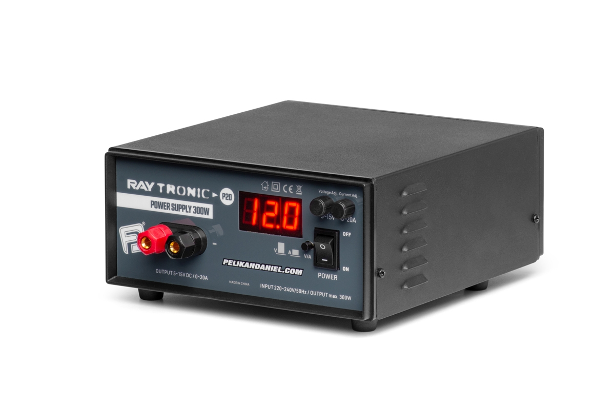 Výkonný stabilizovaný síťový zdroj Raytronic P20 s nastavitelným výstupním napětím a proudovým omezením je ideální pro napájení modelářských nabíječů s výkonem do 300 W a dalších zařízení i testování elektronických zařízení vyžadujících napájení 6–15 V stejnosměrných.