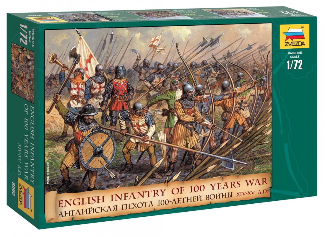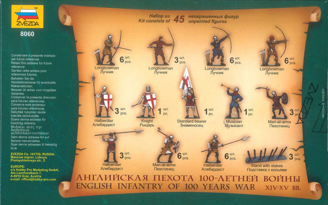 Sada plastikových figurek v měřítku 1:72 zachycující příslušníky anglické pěchoty z období stoleté války. Set obsahuje plastikové výlisky pro stavbu 45 figurek vojáků včetně výzbroje a výstroje.