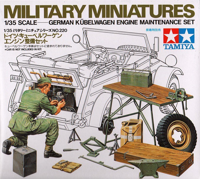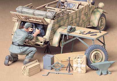 Set nářadí a dílenského vybavení, díky kterému lze vytvořit scénu právě probíhající opravy na legendárním německém vozidle Kübelwagen. Sada obsahuje realistickou figurku mechanika, díly pohonné jednotky, zadní bubnovou brzdu nebo rezervní kolo, díky kterému můžete vyobrazit proceduru jeho výměny. V setu naleznete i mobilní dílenský stůl, skříňku na nářadí a další příslušenství.