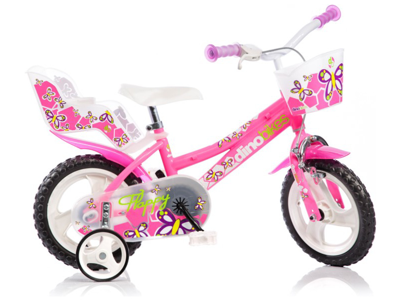 Dětské kolo Dino Bikes - 12"(růžové) se sedačkou pro panenku a košíkem na řídítkách. Kolo má dvanáctipalcová kola s plnými pneumatikami, stálý převod a přídavná stabilizační kolečka. Kolo je opatřeno přední čelist'ovou brzdou.
