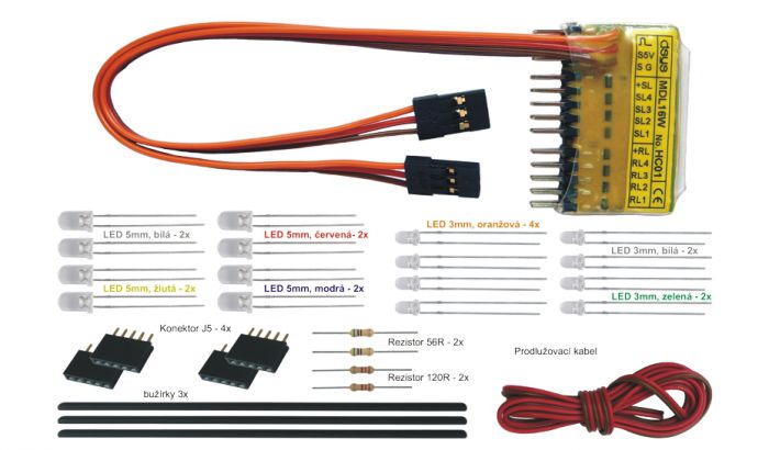 MDL16W (SW 5.3), User Guide, 8× super LED 5 mm (2× white, 4× red, 2× yellow, 2× blue/3,2 V), 8× super LED 3 mm (2× white, 4× orange, 2× green), 4× connectors, 4× rezistors, 3× Heat Shrink tube, 2 wire cable.