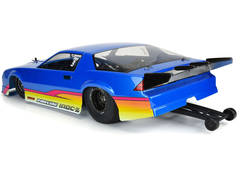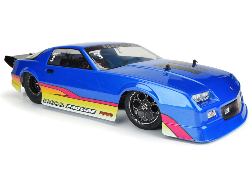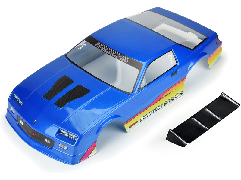 Balení obsahuje předbarvenou (modrou) karoserii 985 Chevy® Camaro™ IROC-Z, zadní křídlo, pamětní minci k 40. výročí Pro-Line.