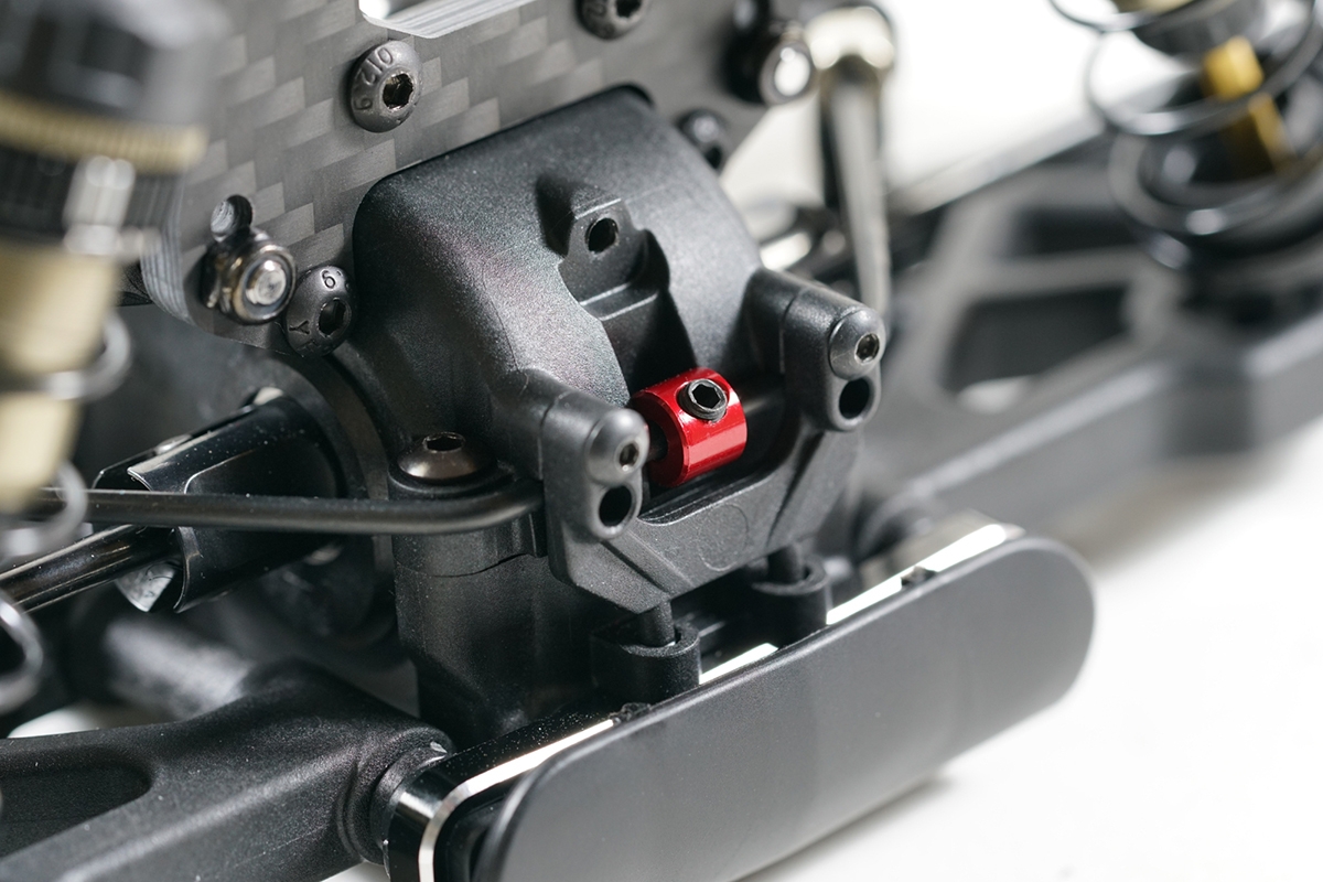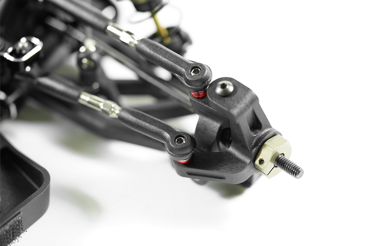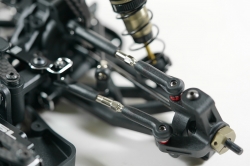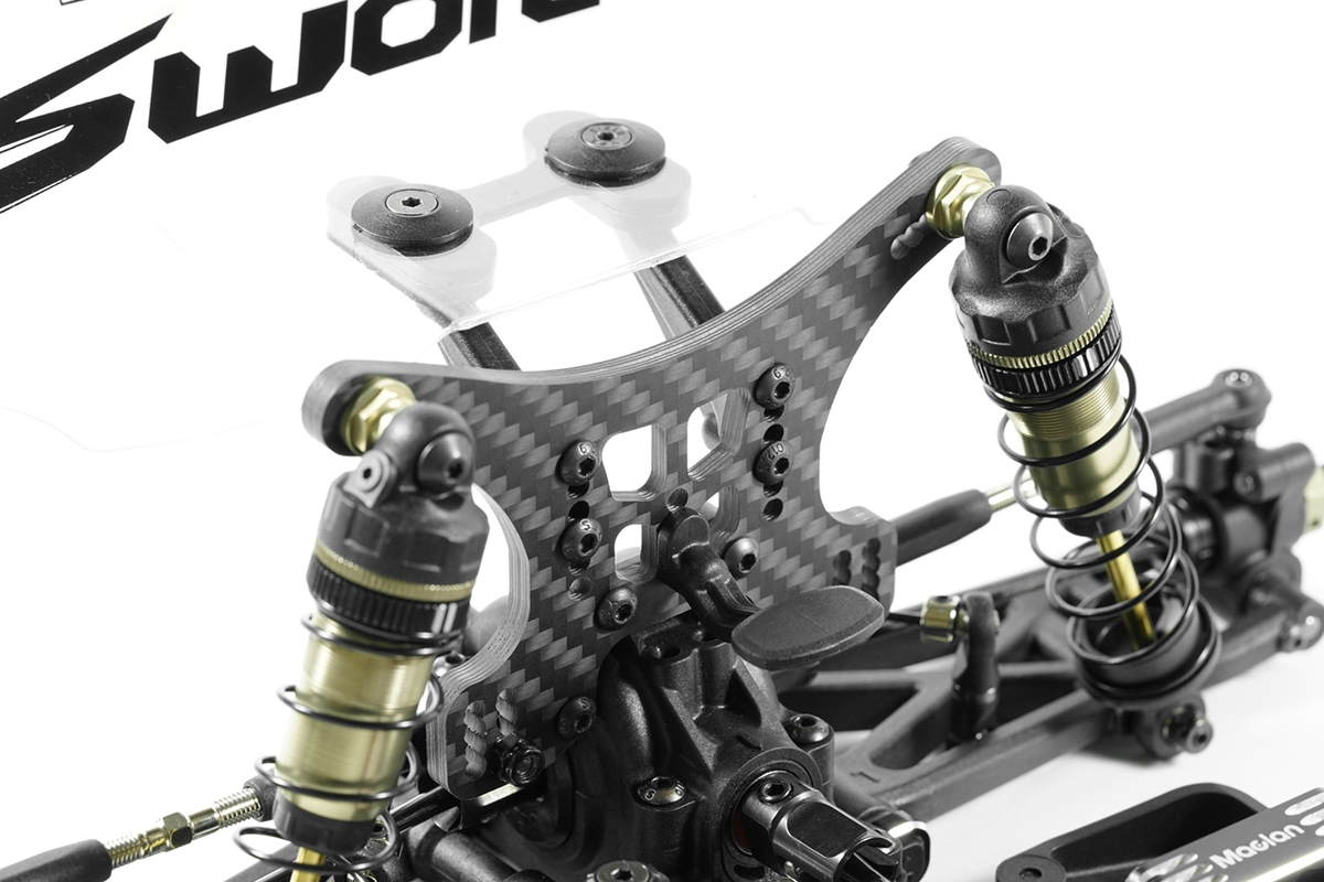 Podvozek je standardně dodáván s 4mm uhlíkovými parohy/držáky olejových tlumičů pro přední i zadní nápravu. Teflonem potažené písty tlumičů jim zajišťují hladký chod. Pružiny Black Line jsou standardně dodávány v sadě SWORKz S14-4C.
