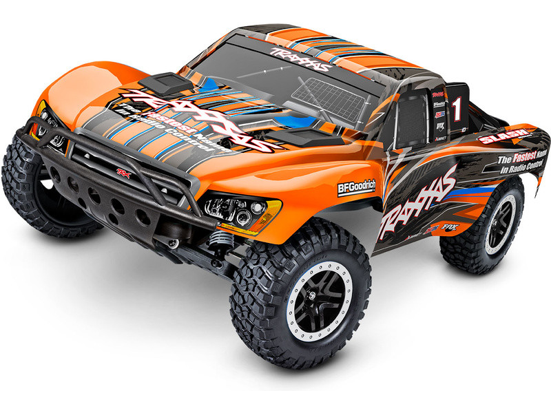 Traxxas Slash je výkonný RC model auta s pohonem zadních kol 2WD, který dosahuje maximální rychlosti až 48 km/h. Kompletně sestavený model pohání výkonný střídavý motor ve spojení s regulátorem BL-2S. RC souprava Traxxas TQ 2.4 GHz je obsahem balení.