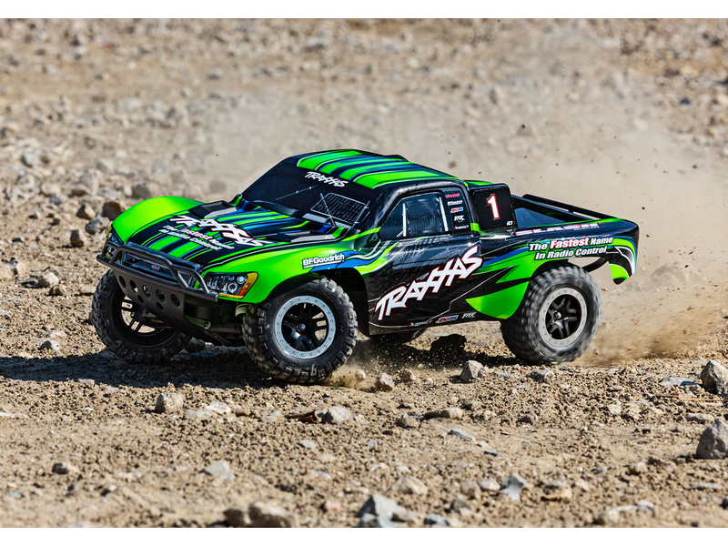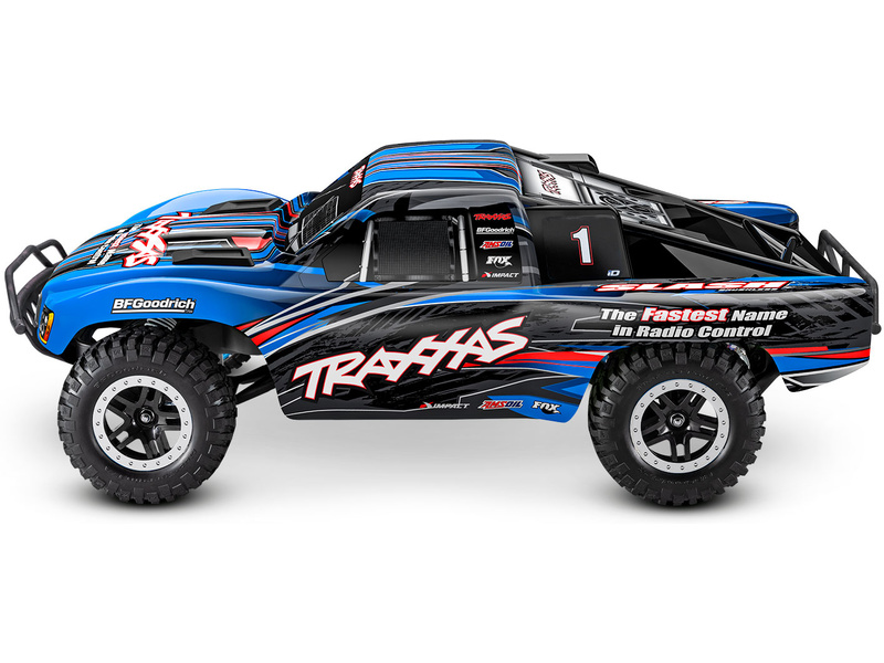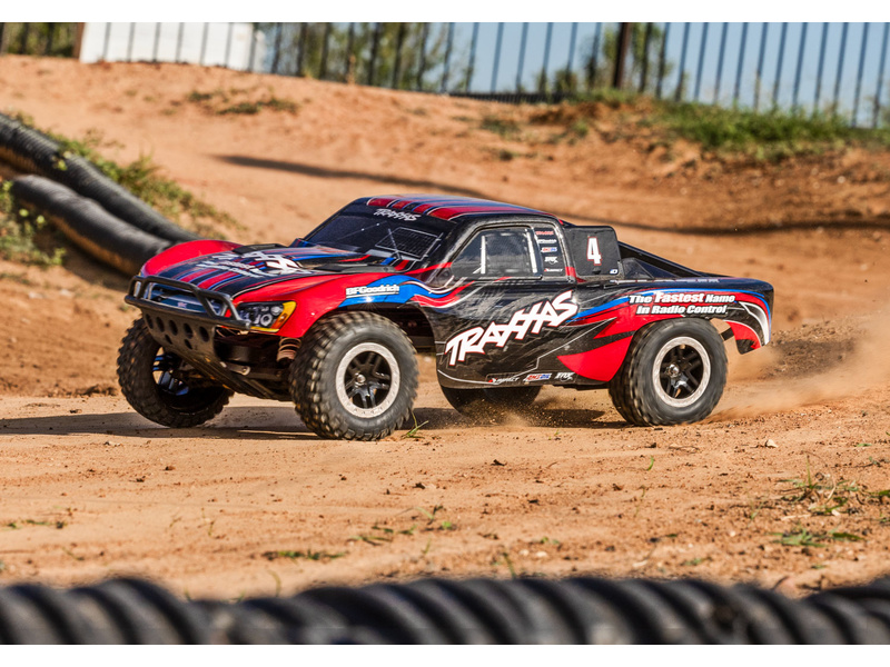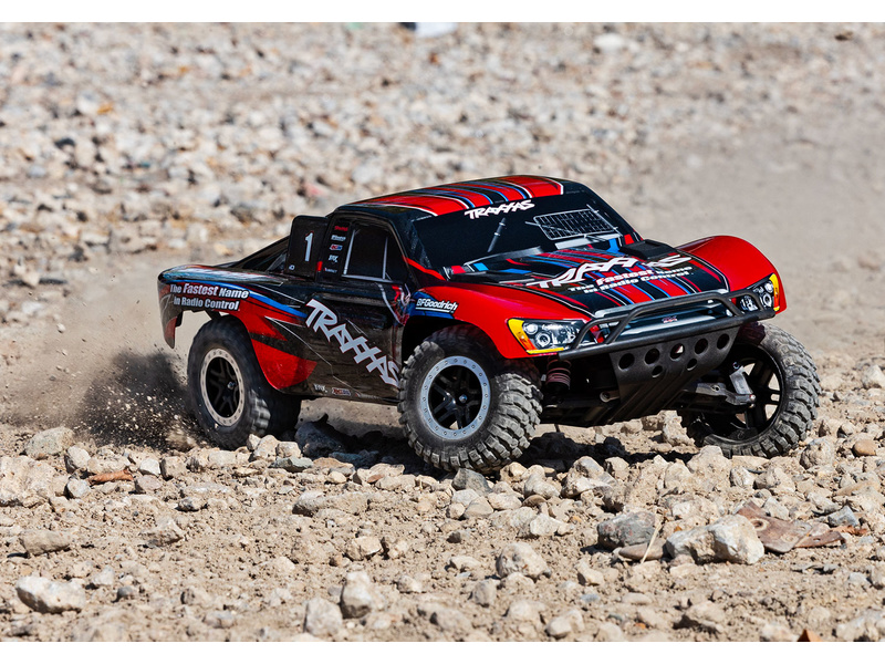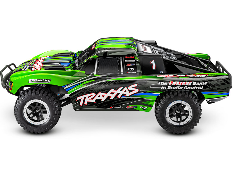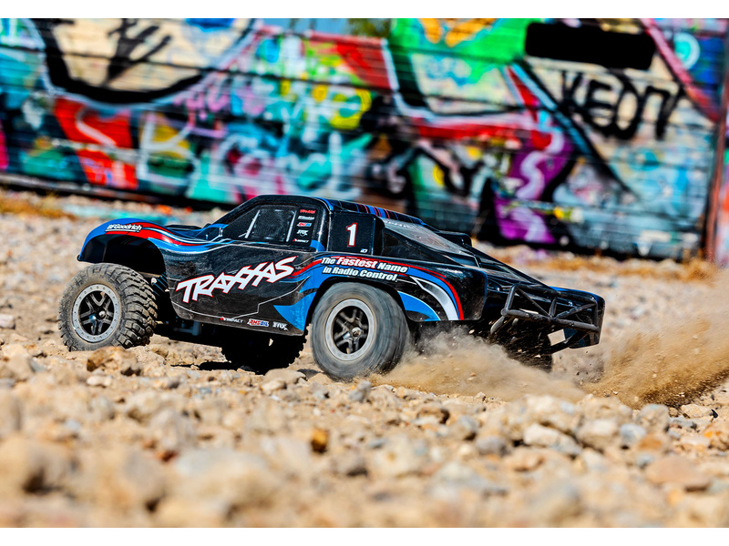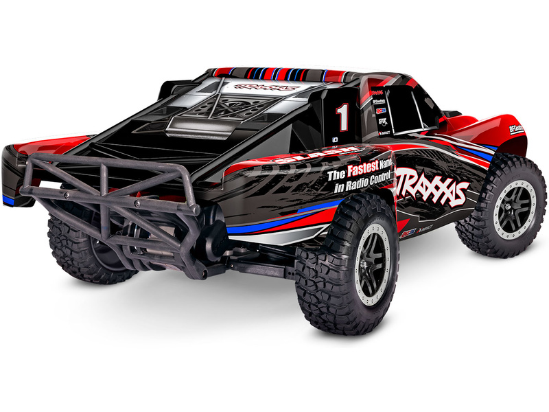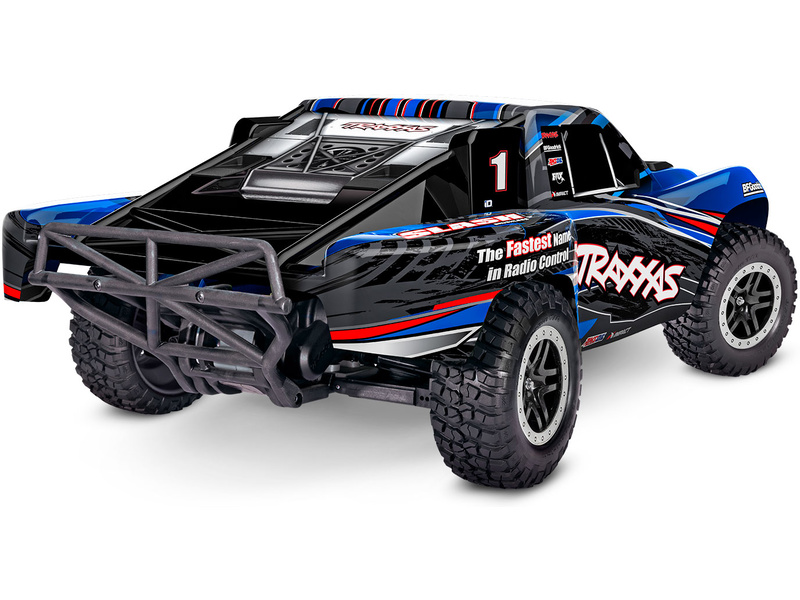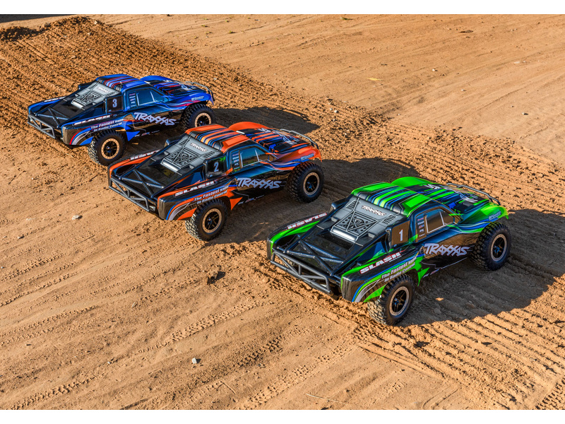 Traxxas Slash je výkonný RC model auta s pohonem zadních kol 2WD, který dosahuje maximální rychlosti až 48 km/h. Kompletně sestavený model pohání výkonný střídavý motor ve spojení s regulátorem BL-2S. RC souprava Traxxas TQ 2.4 GHz je obsahem balení.