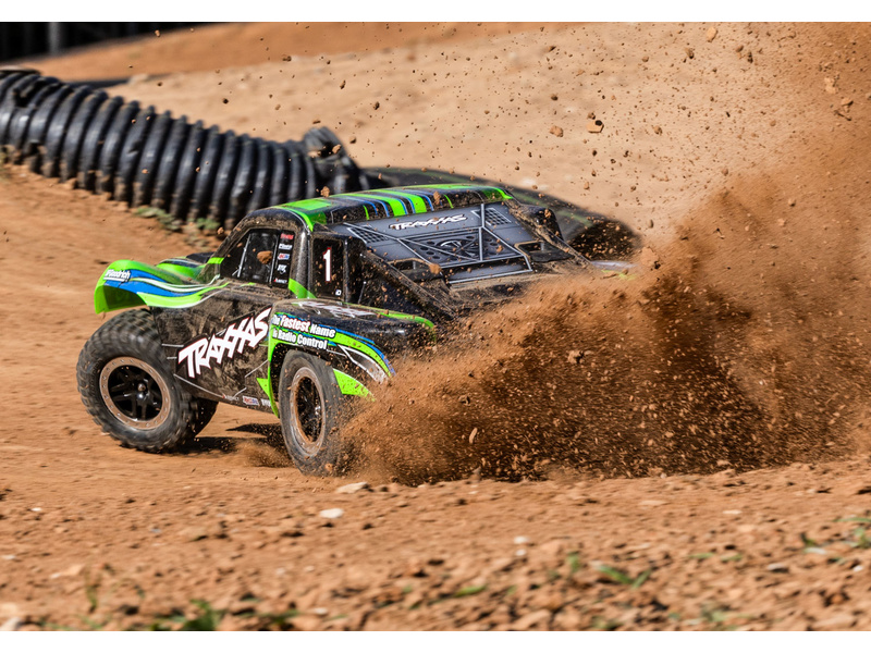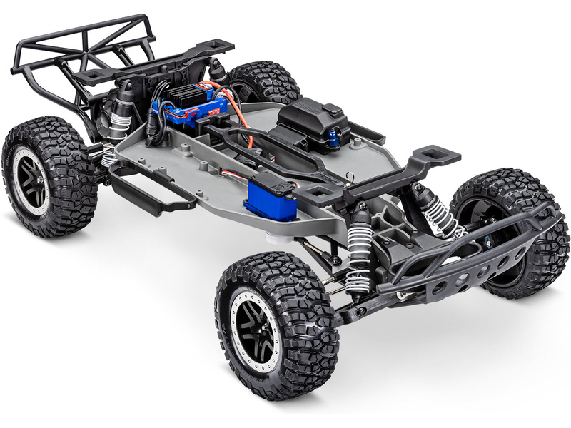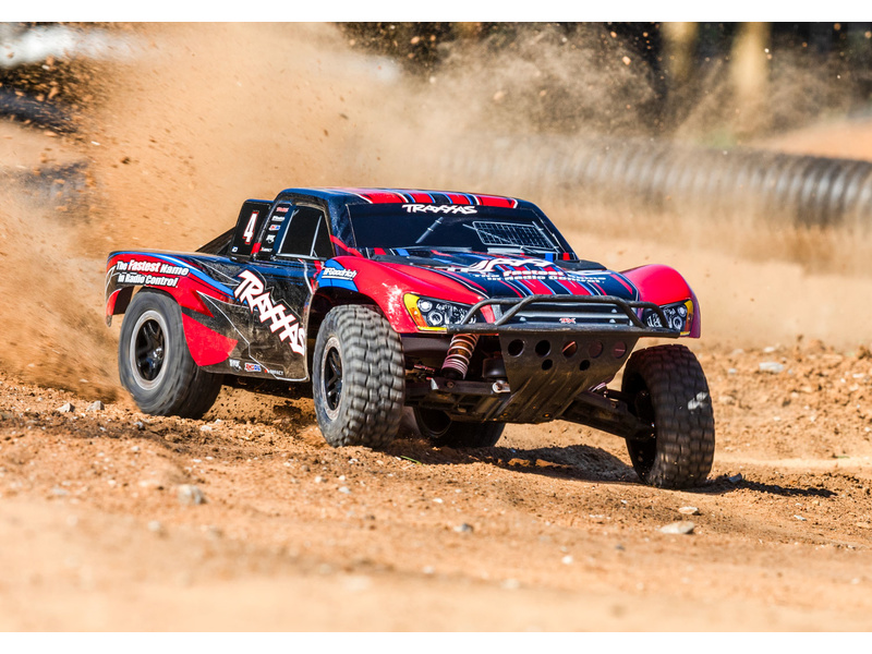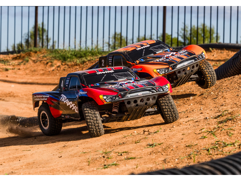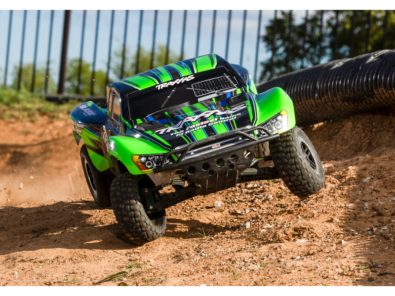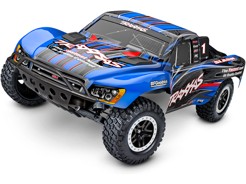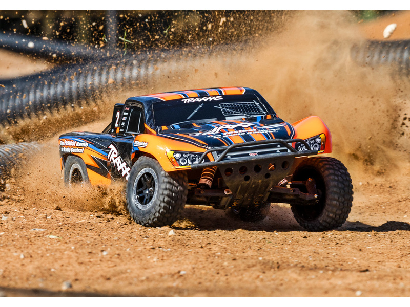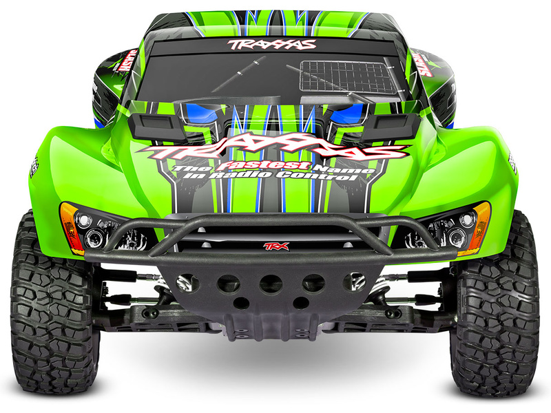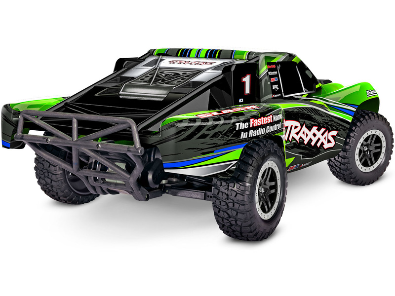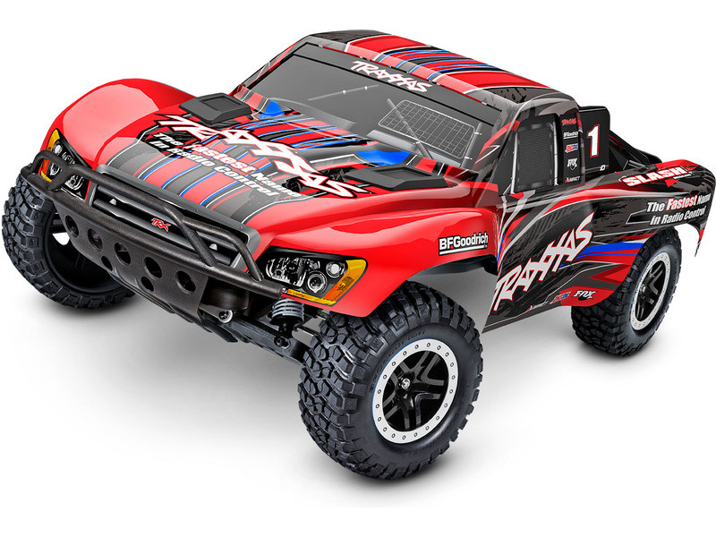 Traxxas Slash je výkonný RC model auta s pohonem zadních kol 2WD, který dosahuje maximální rychlosti až 48 km/h. Kompletně sestavený model pohání výkonný střídavý motor ve spojení s regulátorem BL-2S. RC souprava Traxxas TQ 2.4 GHz je obsahem balení.