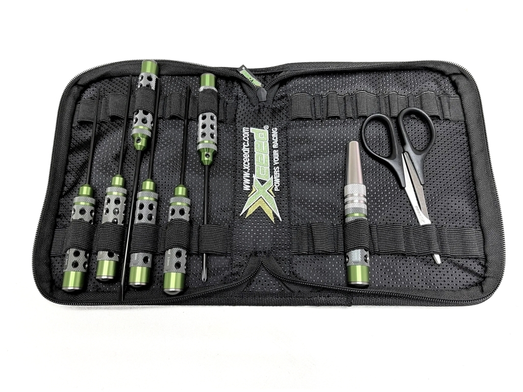 Vysoce kvalitní sada nářadí Xceed s taškou na nářadí Xceed se zipem. Vysoce kvalitní taška na nářadí s úchyty pro všechno nářadí typu HSS a pěknou výšivkou loga včetně malé kapsy na jmenovku/vizitku. Ideální pro odvedení kvalitní práce na podvozcích jak doma při přípravách na závody, tak přímo na závodní trati. Xceed je přehledně uklizen a také chráněn při manipulaci mezi domovem a závody.