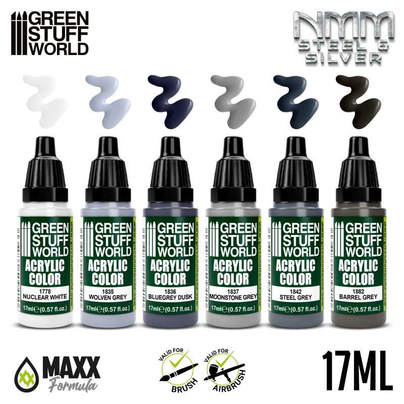 Green Stuff World GSW8436574506129ES - Acrylic Paint Set – NMM Steel and Silver (6× 17 ml)