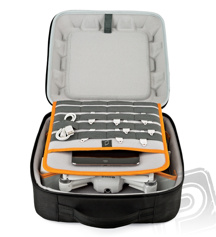 Všitý oboustranný organizér s kapsou na zip na jedné straně a elastickými oky pro uložení vrtulí a dalších náhradních dílů a příslušenství