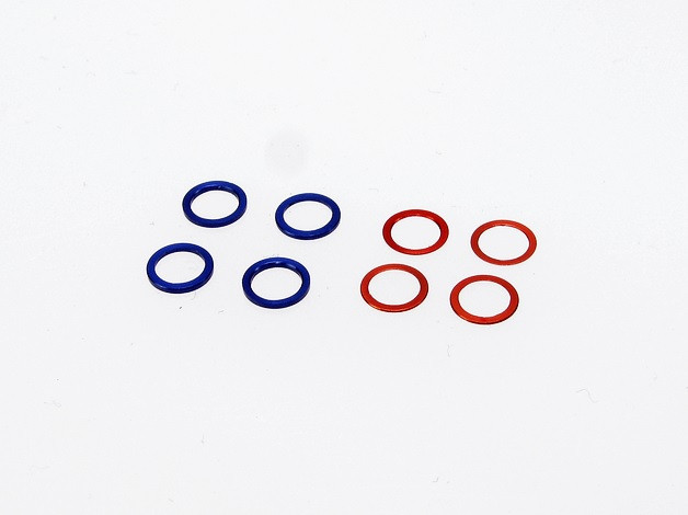 PN Racing Mini-Z MR02/03 Double A Arm Spring Holder Shims Set. Obsahuje 4 ks podložek o rozměrech 3,7×5,0×0.2 mm (oranžové) a 4 ks podložek o rozměrech 3,7×5,0×0,5 mm (modré).